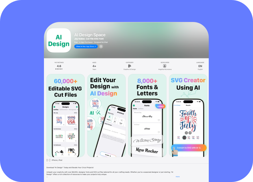 AI Design is an iOS app for Cricut users and crafters, offering a large library of 68,000+ SVG cut files, monograms, shapes, watercolors, and 8,000+ fonts compatible with popular design tools including Design Space. The app allows users to easily create and edit designs using built-in AI tools.