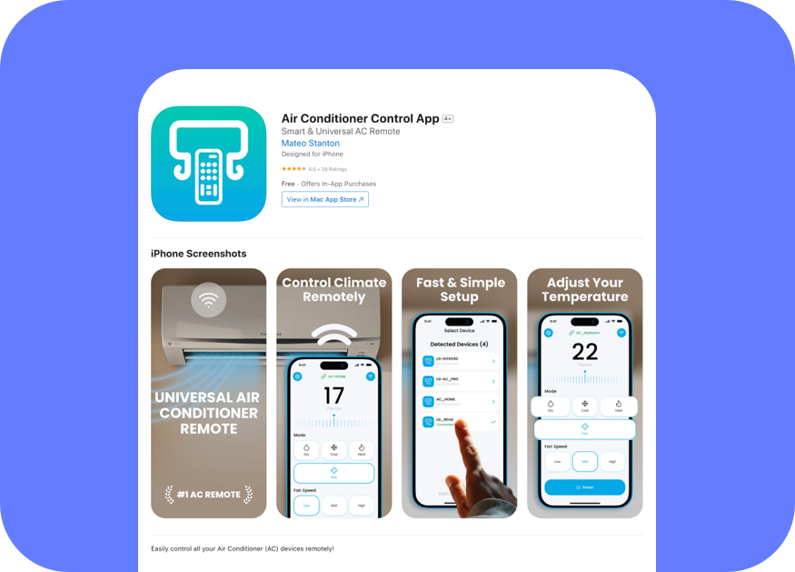 With our Universal AC Remote, you can manage your air conditioner from your phone, no matter where you are, as long as you have an internet connection. Effortlessly power your AC on or off, adjust settings, and set the perfect temperature. The intuitive interface makes it simple to create a comfortable environment and enjoy the convenience of a smart lifestyle—all from your device!