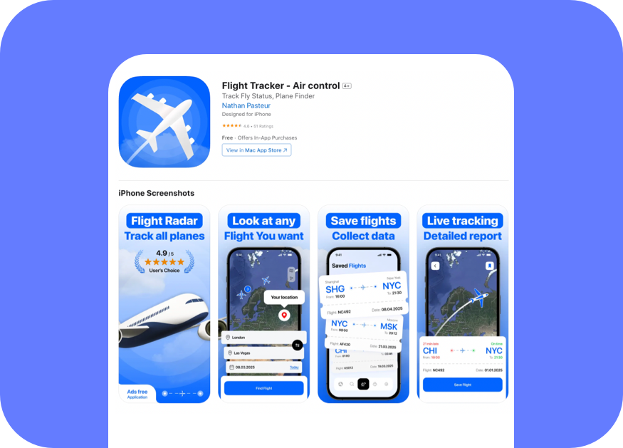 The app delivers real-time tracking for both upcoming and in-air flights, along with instant updates via push notifications. Stay informed with detailed insights into gate changes, delays, cancellations, and enjoy an engaging flight map that visualizes a plane’s route. Whether you’re tracking a nearby flight or monitoring aircraft around the globe, Live Flight Tracker is the go-to resource for aviation enthusiasts, frequent travelers, pilots, and airline crew alike.