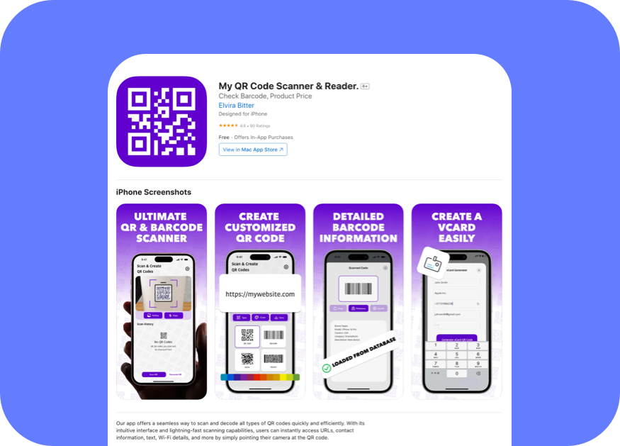 Our app offers a seamless way to scan and decode all types of QR codes quickly and efficiently. With its intuitive interface and lightning-fast scanning capabilities, users can instantly access URLs, contact information, text, Wi-Fi details, and more by simply pointing their camera at the QR code.
