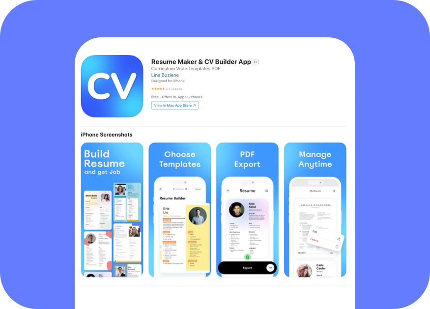 Create professional resume and make your CV stand out from the crowd in few minutes with variety of templates built-in! Nice and easy-to use but works how you expect: choose template you prefer, fill in information about yourself and export! Take your career to the next level!