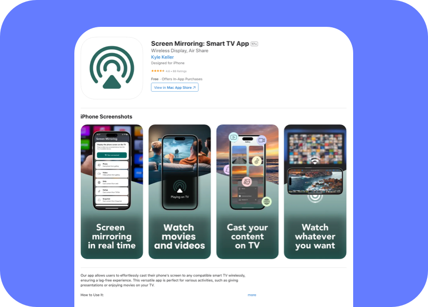 Our app allows users to effortlessly cast their phone’s screen to any compatible smart TV wirelessly, ensuring a lag-free experience. This versatile app is perfect for various activities, such as giving presentations or enjoying movies on your TV.