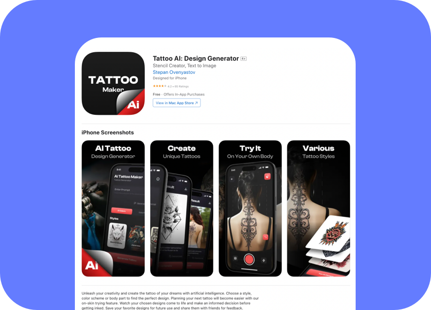 Unleash your creativity and create the tattoo of your dreams with artificial intelligence. Choose a style, color scheme or body part to find the perfect design. Planning your next tattoo will become easier with our on-skin trying feature. Watch your chosen designs come to life and make an informed decision before getting inked. Save your favorite designs for future use and share them with friends for feedback.